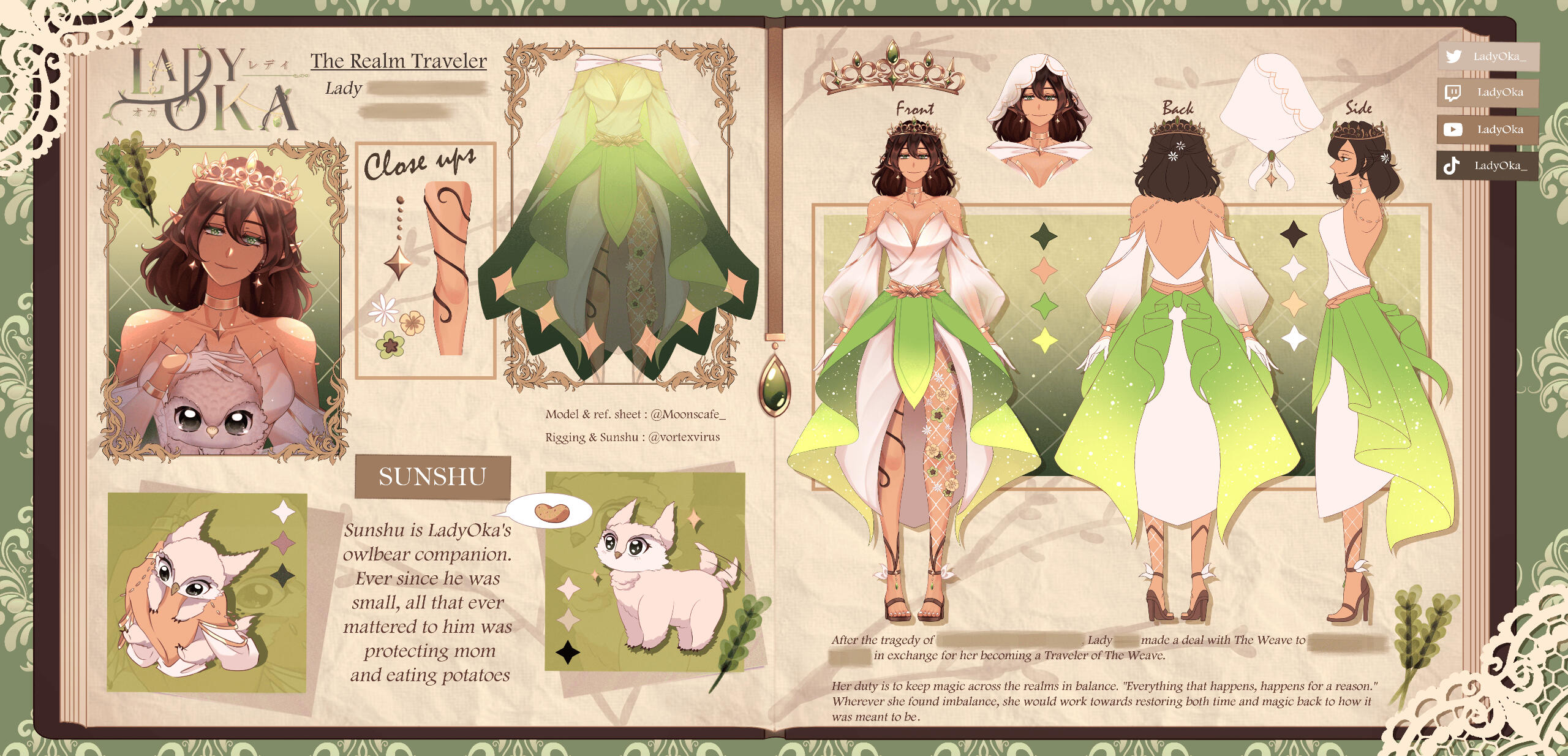 ❝ A Realm Traveler with an unknown origin, Lady's duty is to move along the worlds to protect magic and all that it stands for. When she isn't working however, she resides in her wonderful forest that bursts with kindness and community. With the grass beneath her heels, she looks to uncover her next journey with everyone by her side. ❞